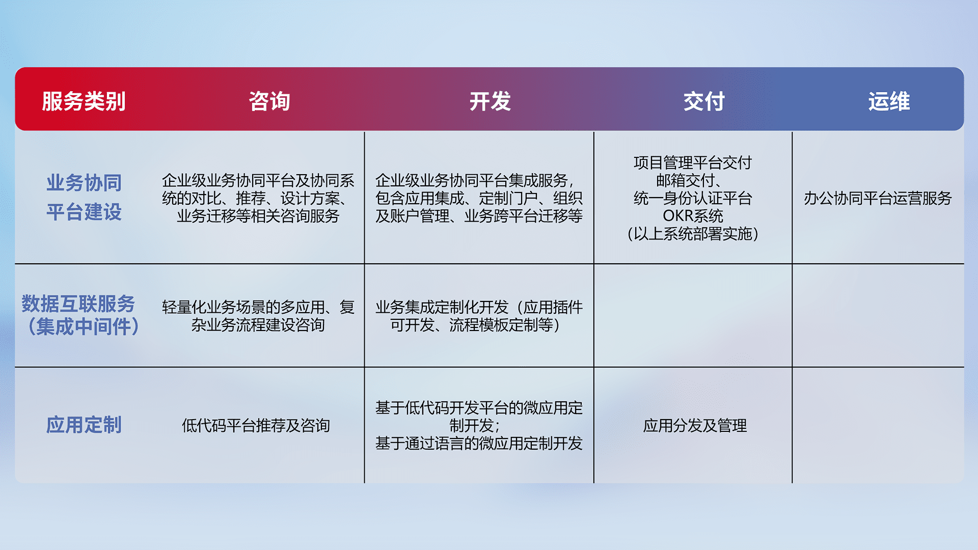 针对钉钉、、、企微、、、IDaas等平台级产品提供产品的规划、、、、方案、、、交付、、定制化开发等服务,,,实现如统一协同办公、、、、智能客户服务、、、、混合会议管理、、、智能数据查询、、、等业务场景,,,实现数字化转型。。。。